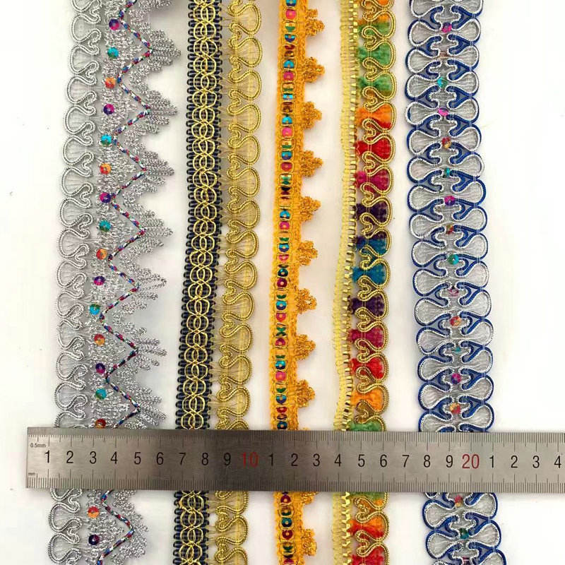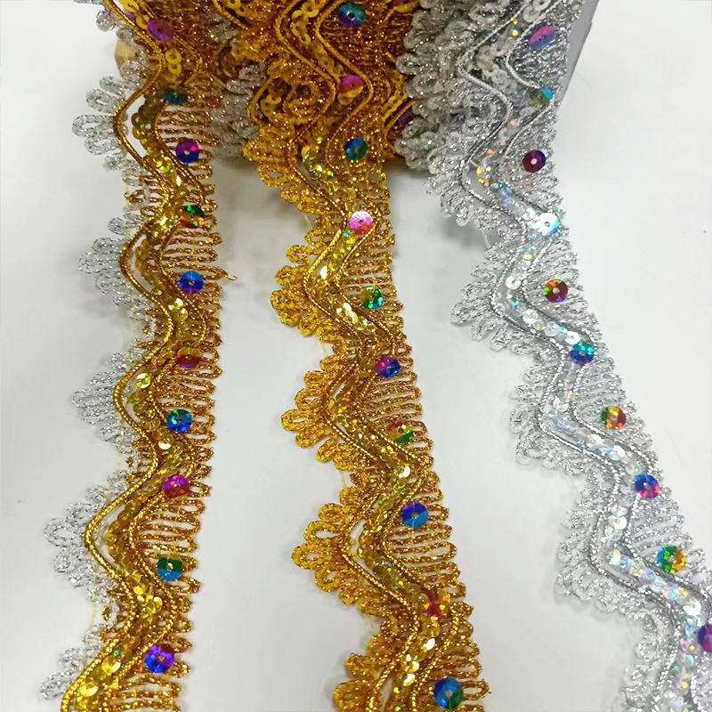 Ruházati kiegészítők arany és ezüst fémes határcsipke díszítés Multolor flitter arany szálú fém csipke díszítés arany és ezüst, kétszeres fémhuzalokkal és hét színű flitterekkel díszítve, ez csodálatos és káprázatos szegélyhatást eredményez. Ez alkalmas mandzsetta, gallér és csúcsminőségű ruházat dekorációjára, például estélyi ruhákra, színpadi jelmezekre és esküvői ruhákra. Az anyag könnyű és rugalmas, nem halványul vagy tabletta, és támogatja az egyedi szélességet és a mintákat, és egy luxus csillogást ad a ruházathoz.