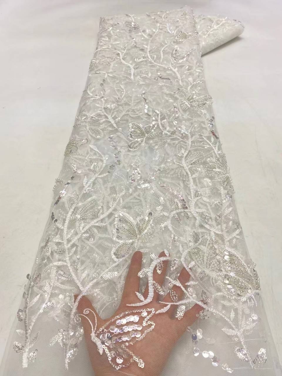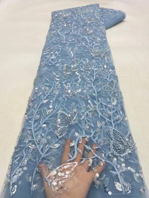 Színes esküvői csipke szövet, 3D pillangó gyöngyös, hímzett udvarokkal, háromdimenziós 3D-s pillangó gyöngyös hímzéssel, luxus és finom, kifejezetten testreszabott esküvői ruhákra és estélyi ruhákra. Minden udvar finoman hímzett flitterrel és gyöngyös ékezetekkel. Könnyű és lélegző, alkalmas menyasszonyi fátyolok, ruha dekorációk vagy estélyi ruhák készítésére.